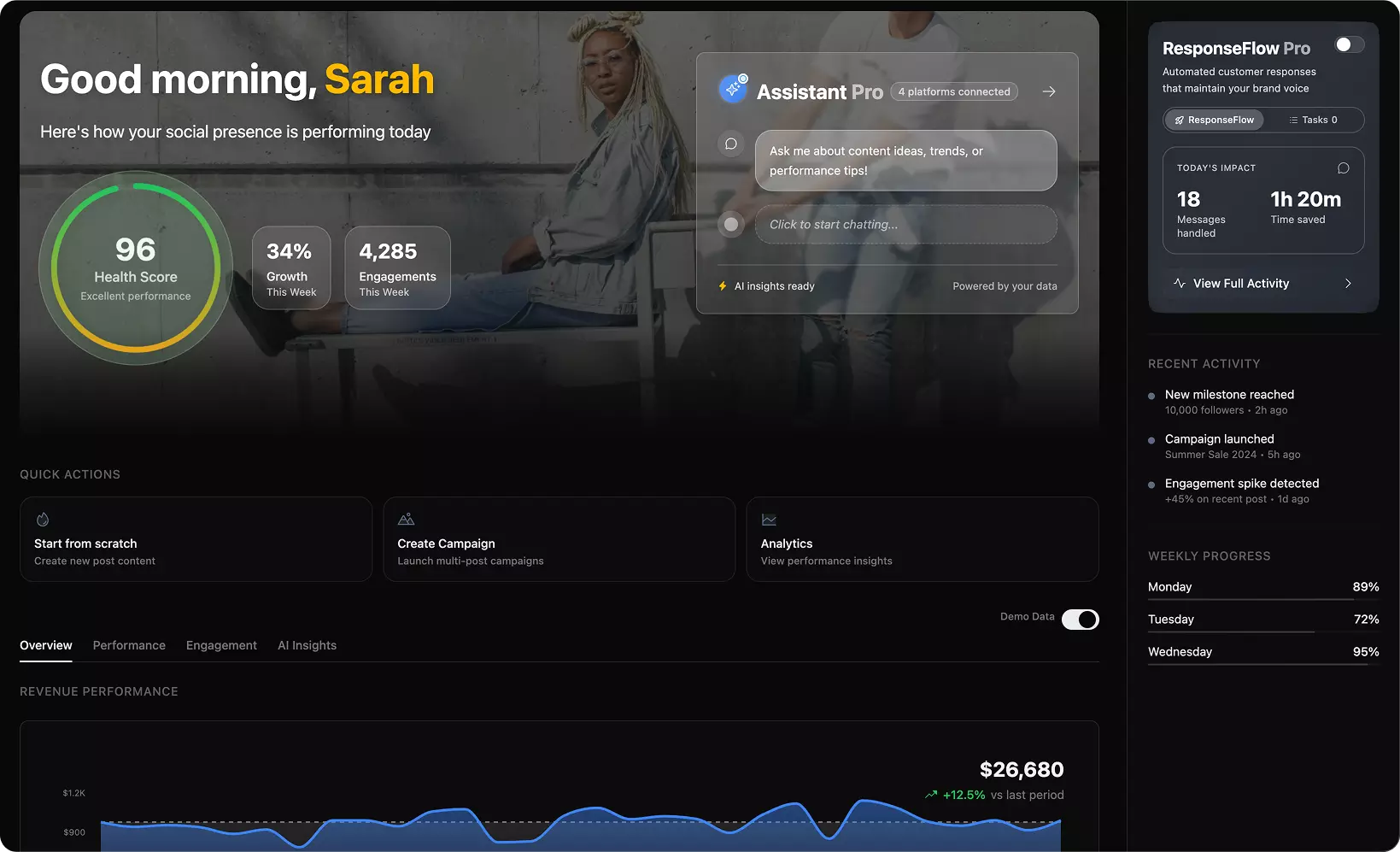 Use the AI assistant to create your first campaign - whether it's a seasonal sale or product launch. Schedule posts across all your platforms in seconds.
